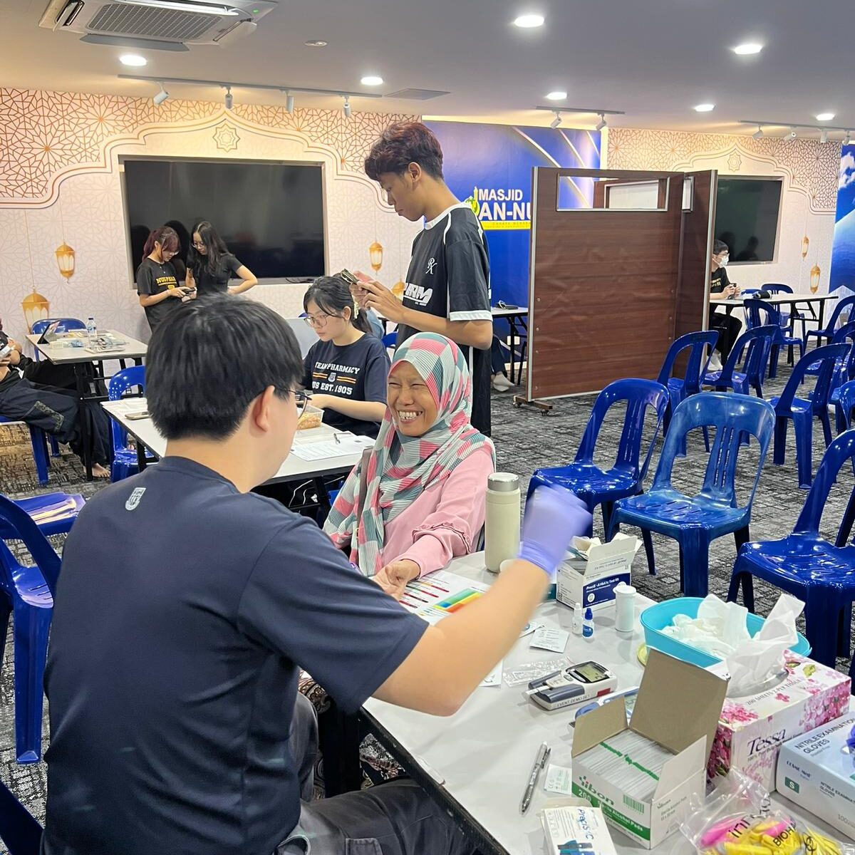 The event was held at Masjid An-Nur and offered complimentary health checks aimed at screening the community for the “3 Highs” — high blood sugar, high cholesterol, and high blood pressure — as well as height and weight assessments, dementia screening, strength testing, and pharmacist counselling.